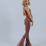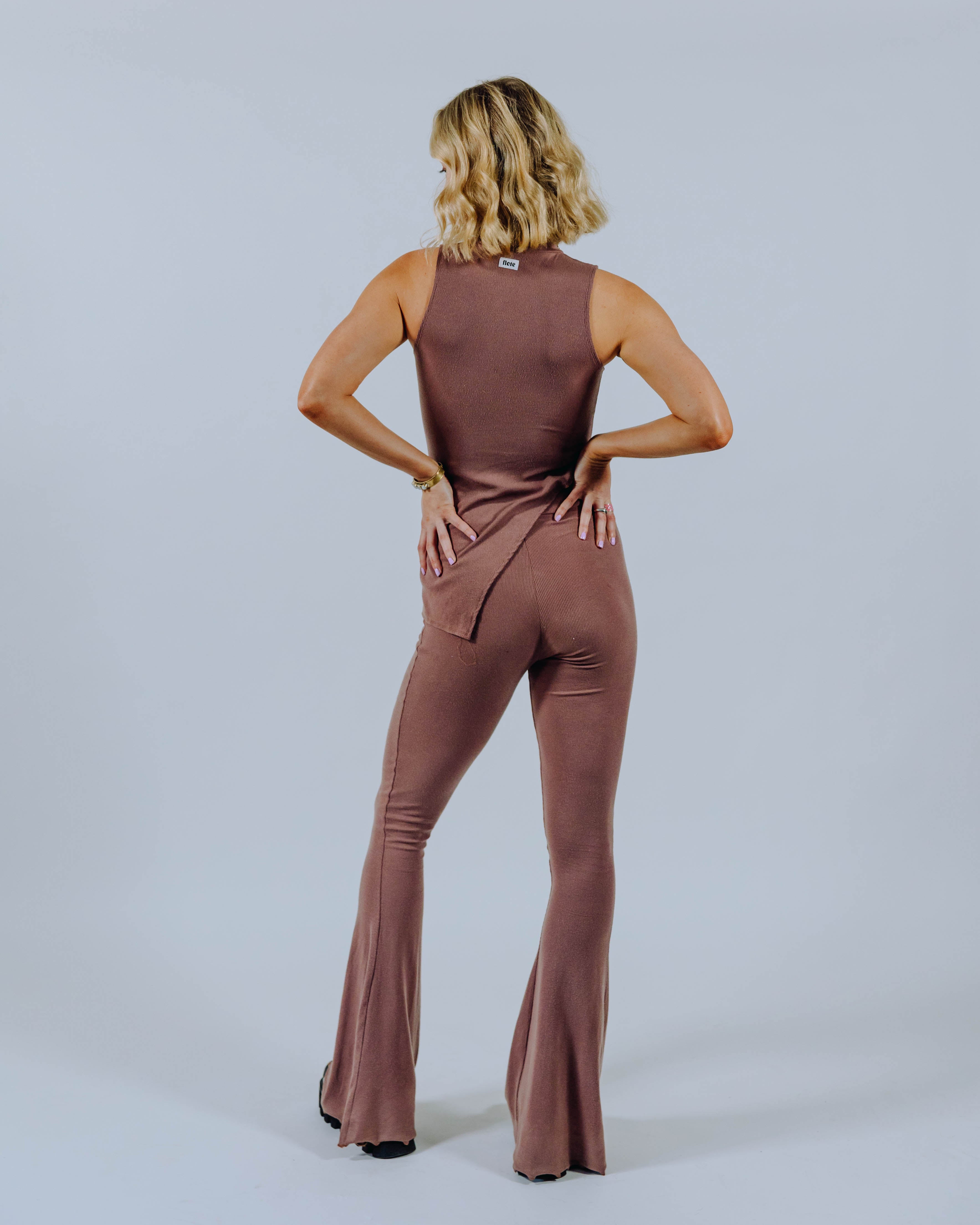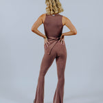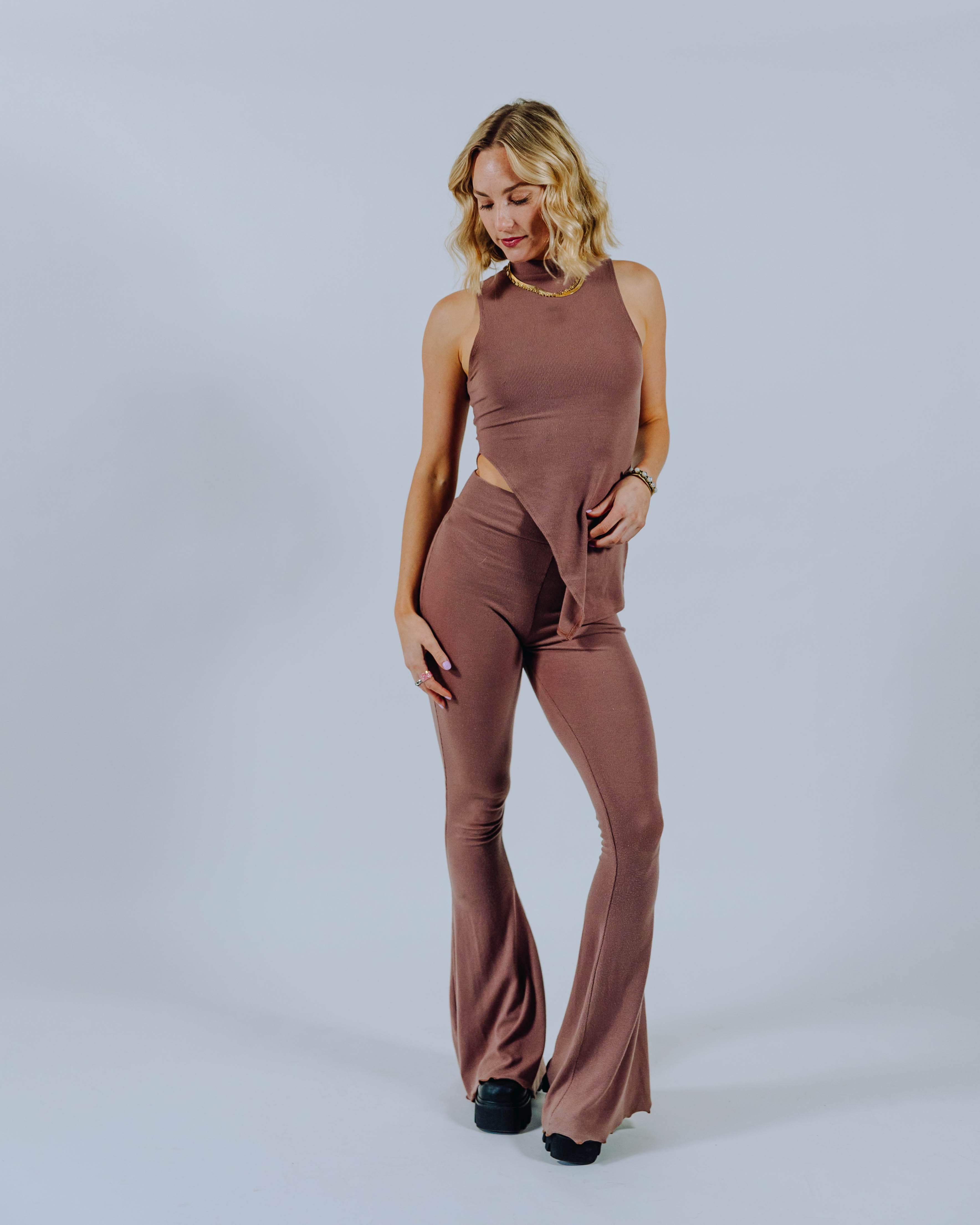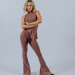 From hanging on the couch, to an evening out, this set can be styled up or down to keep you comfy and cute no matter the occasion. Ultra soft and stretchy ribbed material is fitted but not restrictive. Features a mock neck asymmetrical top and high waisted flare pants.