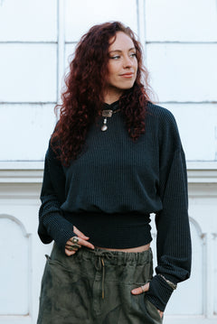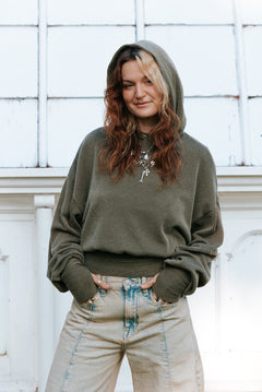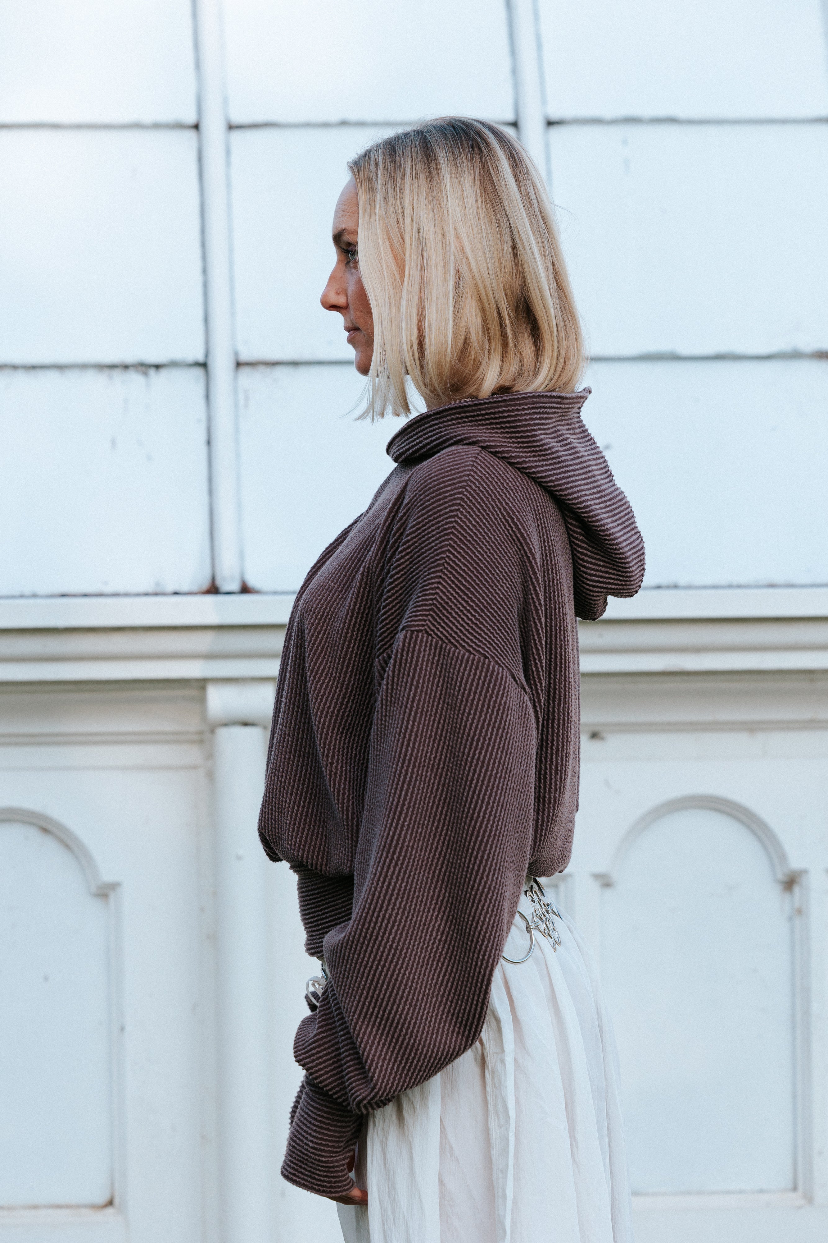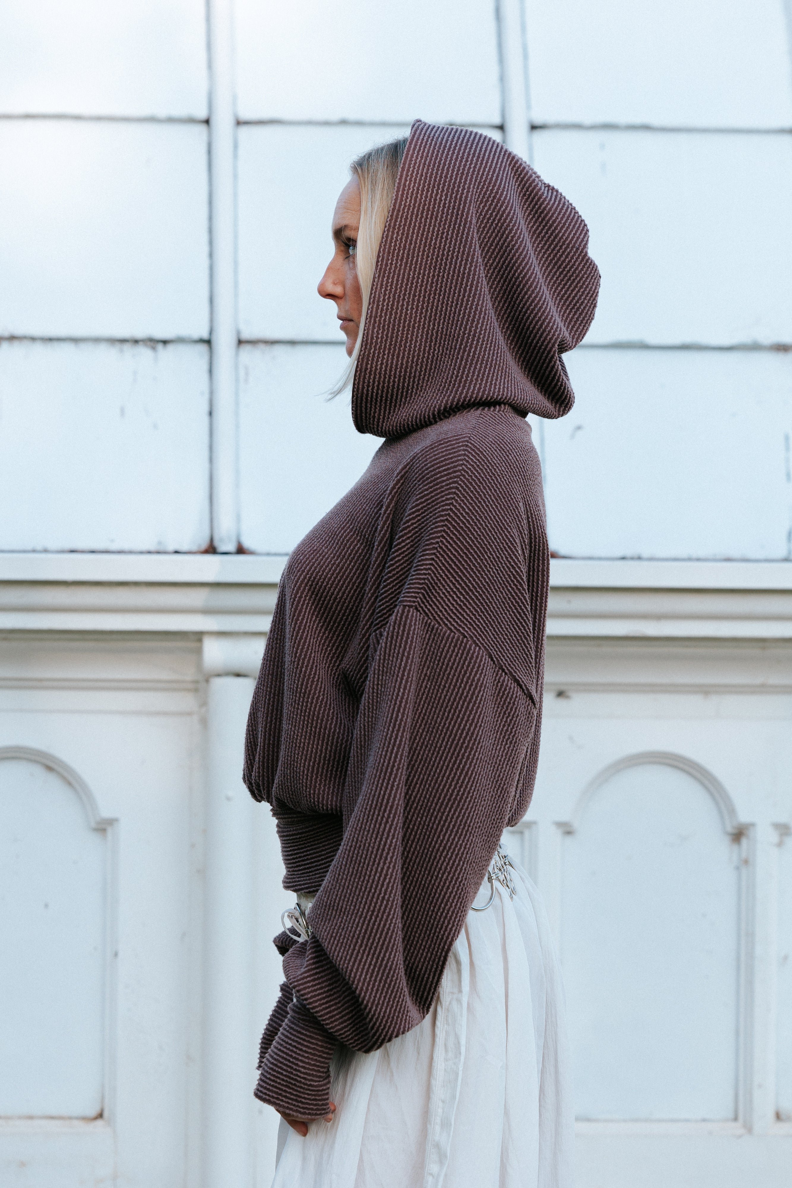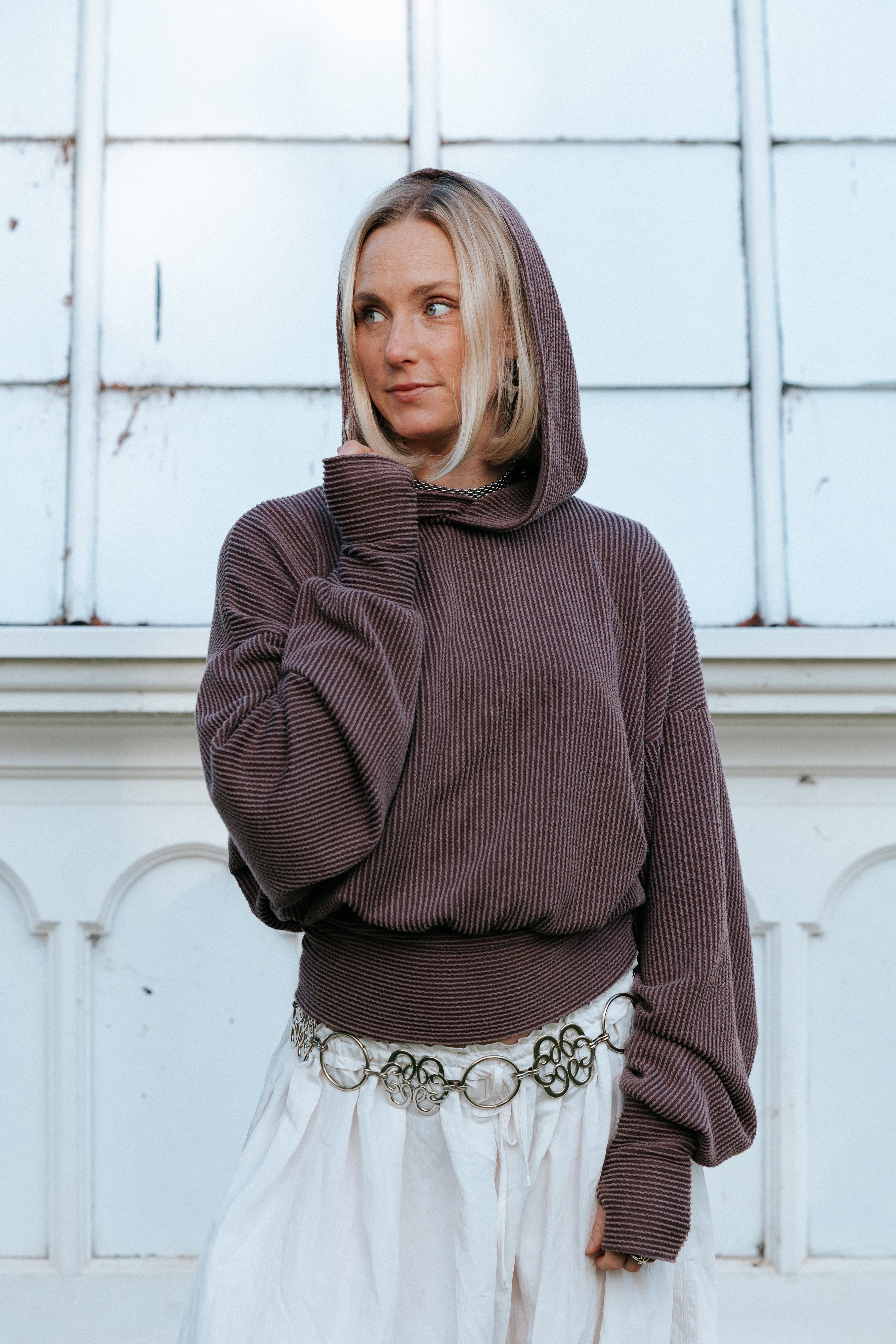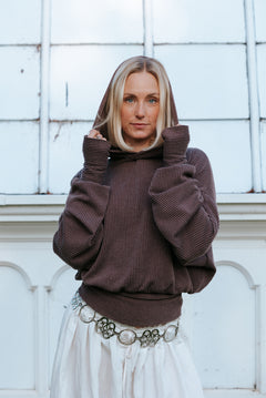 The Groove Hoodie is your new go-to cozy layer. Crafted from chunky ribbed fabric, it drapes into a relaxed, oversized silhouette with a softly cinched waistband and built-in fingerless cuffs. An easy, everyday essential for where ever your day takes you.